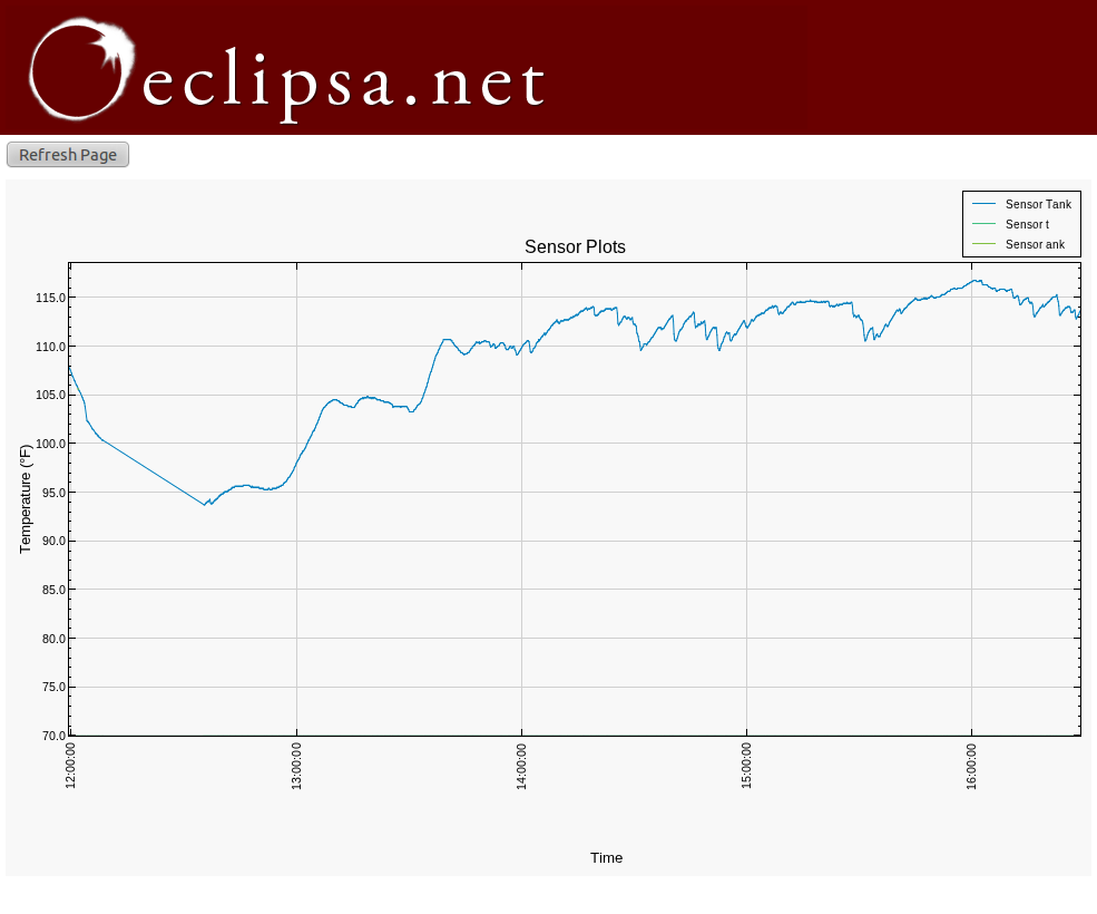 Here's a screenshot of data from the last day of the KC Maker Faire (June 26th, 2011). There's only one dataline in this graph; originally, there were 4. The tape in the reservoir holding up the water protection for one of the OneWires failed, causing it to short out. I hastily changed the sensors around and tweaked the Arduino code to only show the remaining sensor.